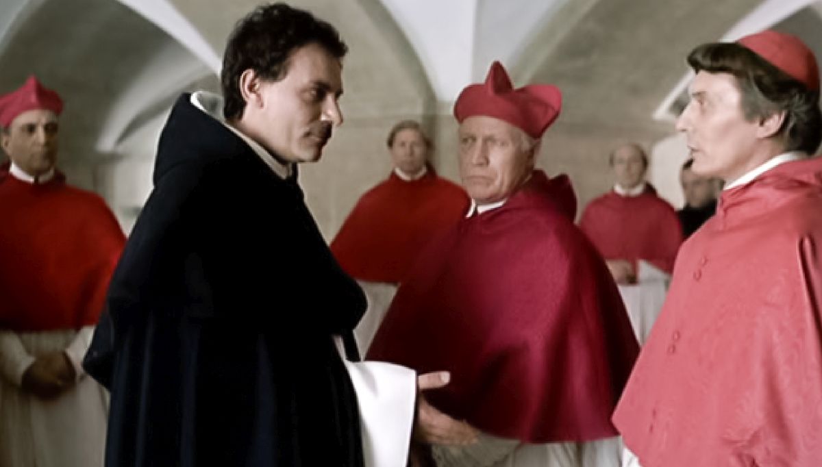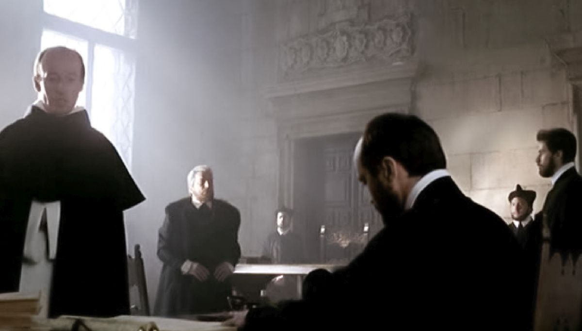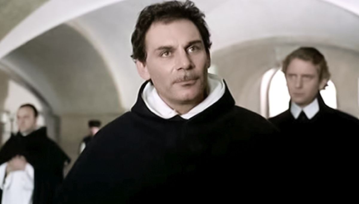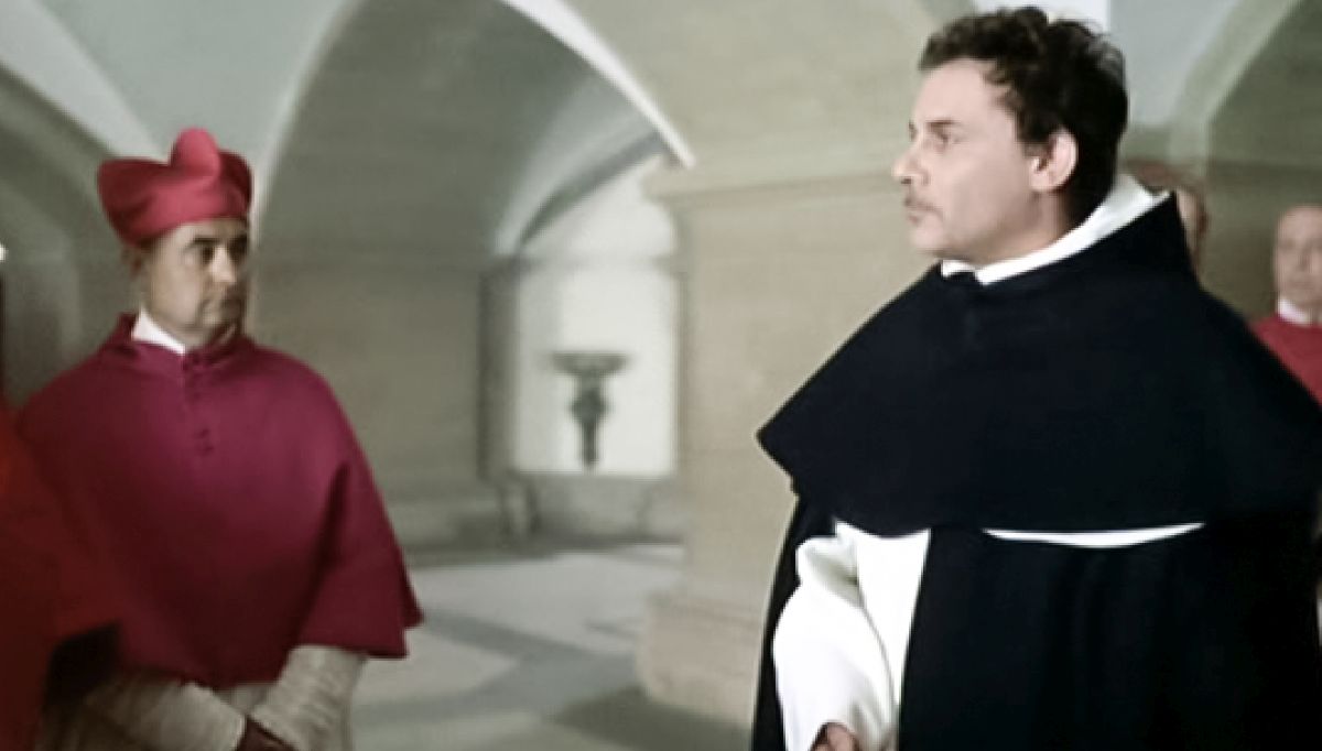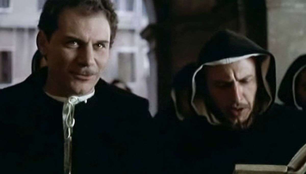 Venezia, Giordano Bruno prende motivo da una processione commemorativa della vittoria di Lepanto per condannare una religione che fa uso della violenza. Fra amici e poi con l'amante, espone le sue idee filosofiche e il suo concetto di una duplice religione: una fatta per il popolo, l'altra che è liberazione e superamento, riservata ad uomini superiori. Un suo ospite, è spaventato da questo ex frate così spregiudicato, più spesso ubriaco che sobrio, e lo denuncia all'inquisizione. Rivestito l'abito domenicano, Bruno affronta gli interrogatori e, nonostante l'opposizione del Patriarca, viene trasferito a Roma...